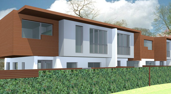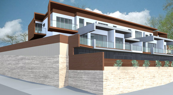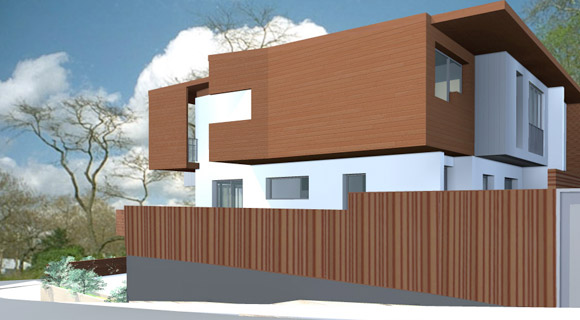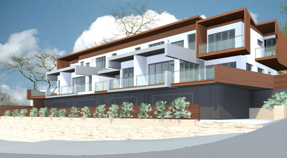 There are 4 boutique townhouses in this development on the corner of Sydney and Parkview Rd, Fairlight. The 3 bedroom units were designed with timber cladded boxes in zinc roofing to perch on top of the sandstone base. Each townhouse is 3 storey high with garage cut into the sandstone escarpment. There are overhanging balconies off living and family rooms of each unit to maximise views to Manly beach and town centre. /h4>